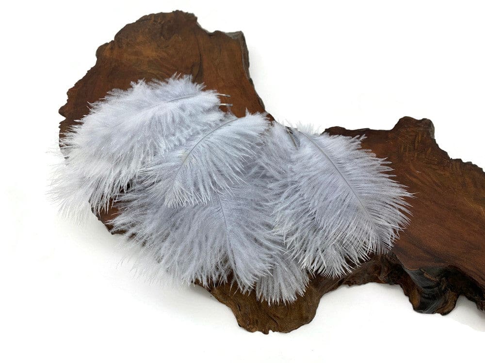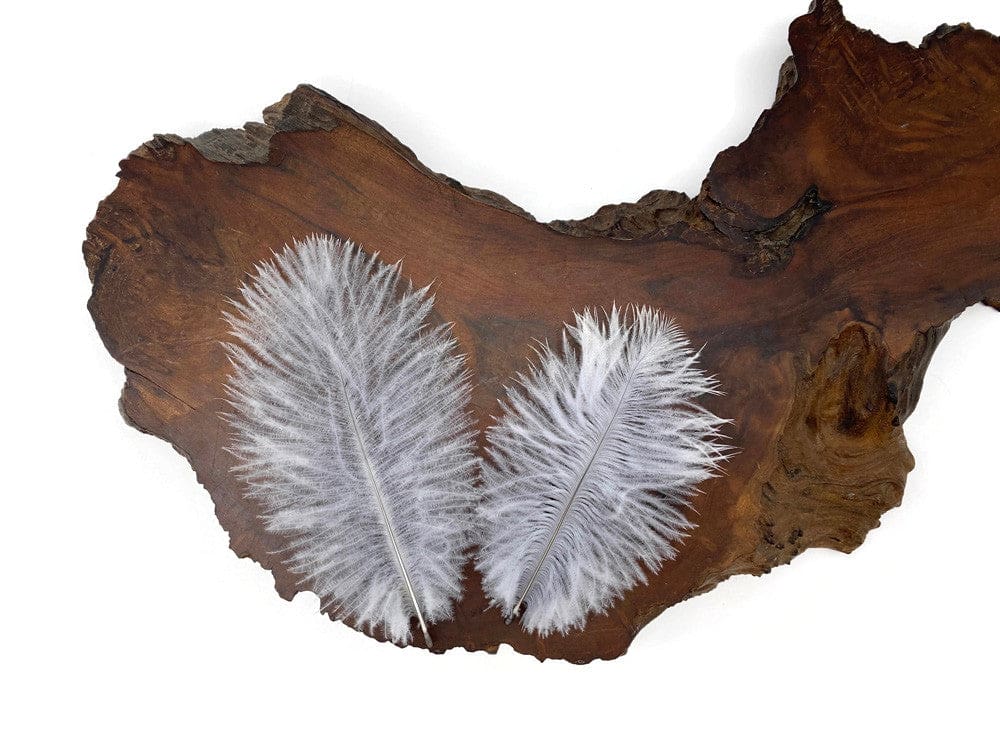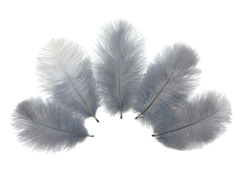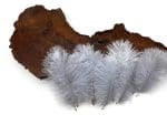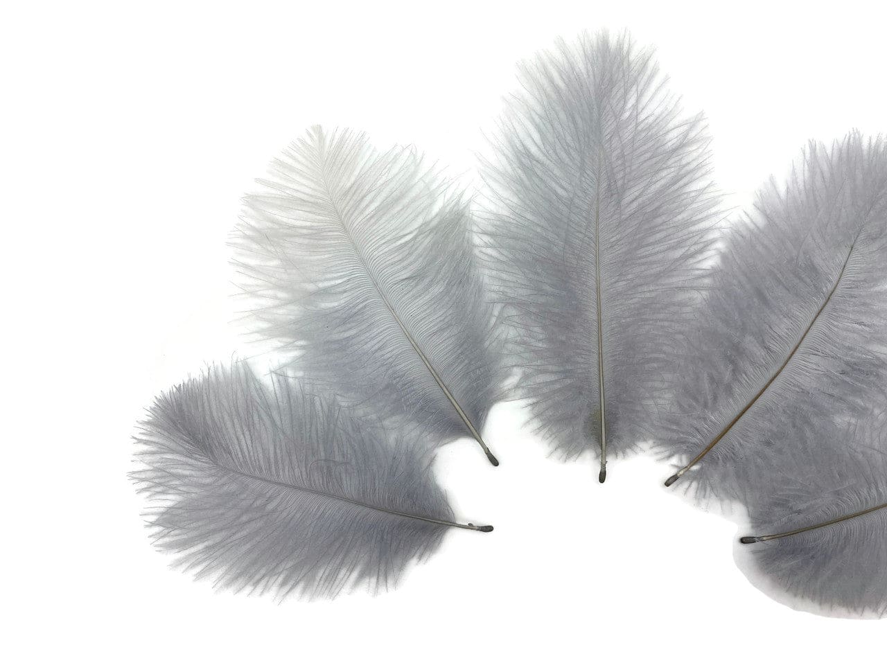 Ce lot comprend un paquet de plumes en gros d’autruche gris argenté, mesurant entre 3 et 5 pouces. Chaque plume possède des barbes délicates semblables à des cheveux, émergeant de la hampe rigide au centre de la plume. Ce lot contient environ 300 à 500 plumes.